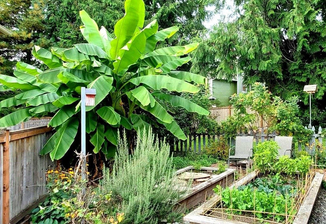 I discovered bananas as a garden project during a “Bainbridge In Bloom” garden tour. Famous Bainbridge Island gardeners and artists George Little and David Lewis have a large banana grove, so are experts on how to care for them.
