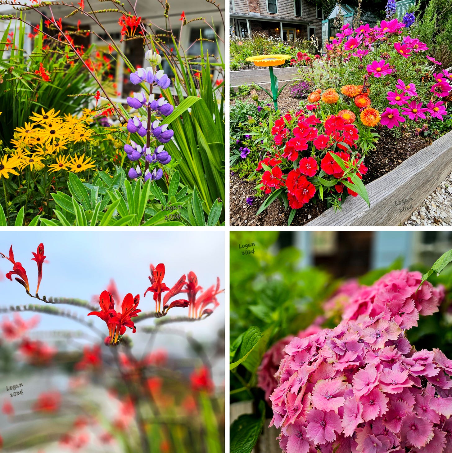 Flowers are everywhere: black eyed Susans, zinnias, roses both wild and domestic, aromatic lavenders, Shasta daisies, deep blue and pink hydrangeas and plenty of red crocosmia for the hummingbirds.